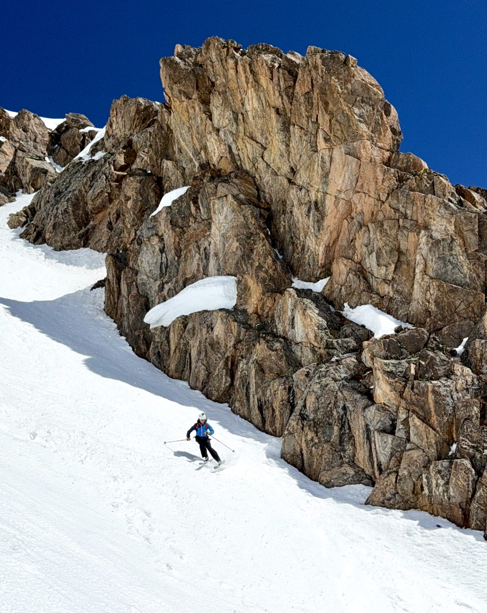 From that point forward, everything clicked. The weather. The snow. The decision-making. The line—a dream for so long—was in. We skied the direct SE face off the summit and then dropped into the tangled W-NW face. Somehow, despite a below-average snowpack this year, both lines went. We linked 4,000 vertical feet of fantastic skiing.