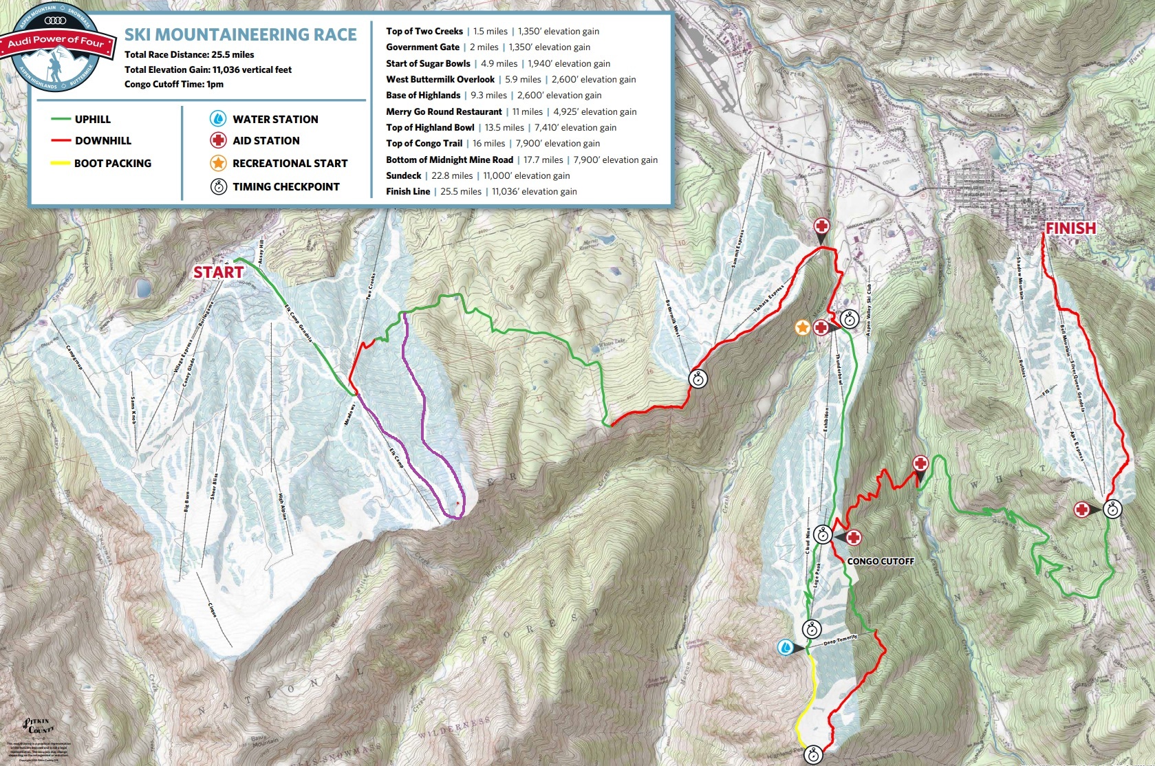 Since the race’s inaugural run in 2011, the Audi Power of Four has become known in skimo circles as one of the more difficult winter endurance events in North America. Traversing up and over the four ski areas in Aspen, the course racks up over 11,000 feet of elevation gain and ~29 miles from start to finish. Like most skimo races, it’s very conditions dependent as well, which can further add to the challenge…