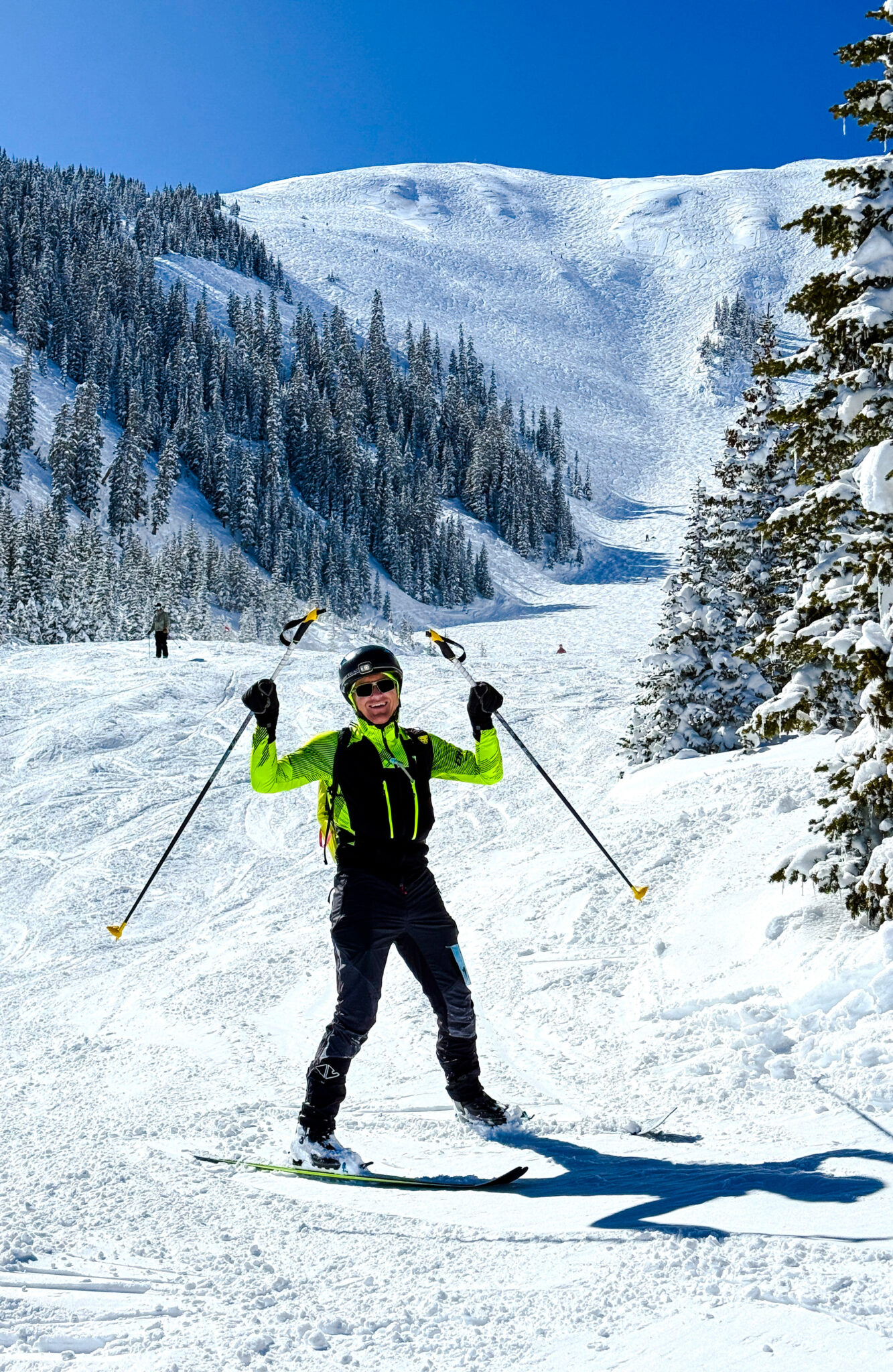 On the final ski down Ajax in the waning afternoon light.